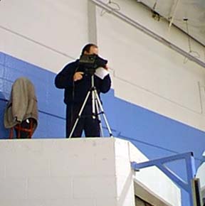 FTLComm - TisdaleDecember 21, 1998 It all started rather innocently with a camcorder six years ago with two boys playing hockey and a desire to capture their games on tape. The original attempts were boring and just catching a few plays didn't get the feel of things so it was decided to shoot the whole game, but that too was boring, commentary and play by play was added and there was a story and the we have closets of tapes from season after season of games. With the sons no longer playing, the passion for the game remains and Timothy Shire still gets out and records a game when ever some one wants one. From a perch atop the zamboni room |
